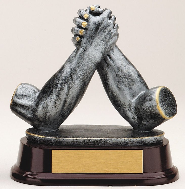 An Elegant Pewter And Gold Arm Wrestling Award With Black Finish Base