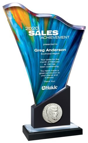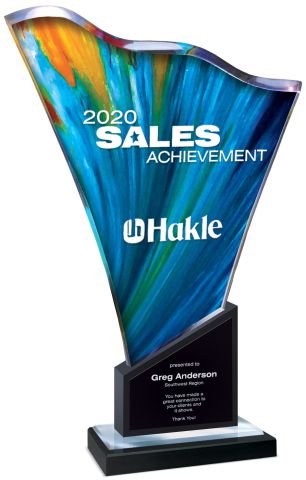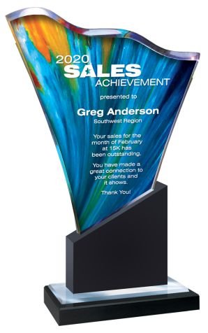 Elegantly hand crafted, full color. Wave-cut Lucite with Mirror Bottom on Black Marble Base