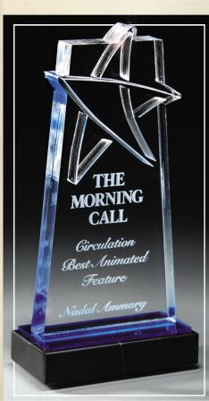 An Elegant Blue Lasered Star On Black Accent Base. Fully Laser And Rotary Engravable