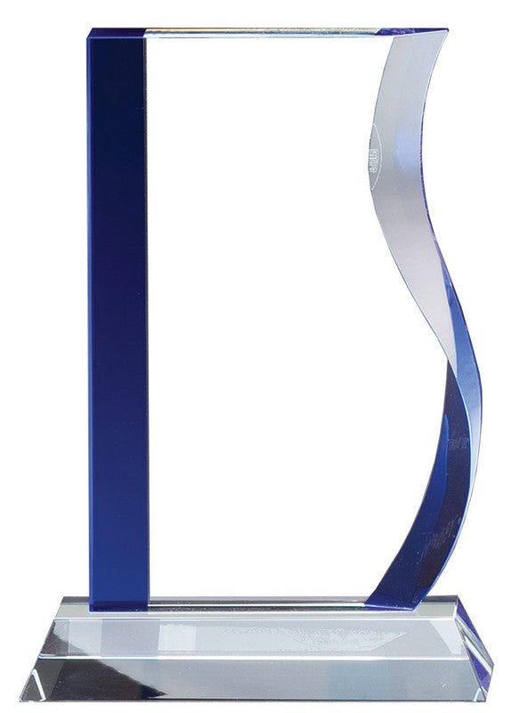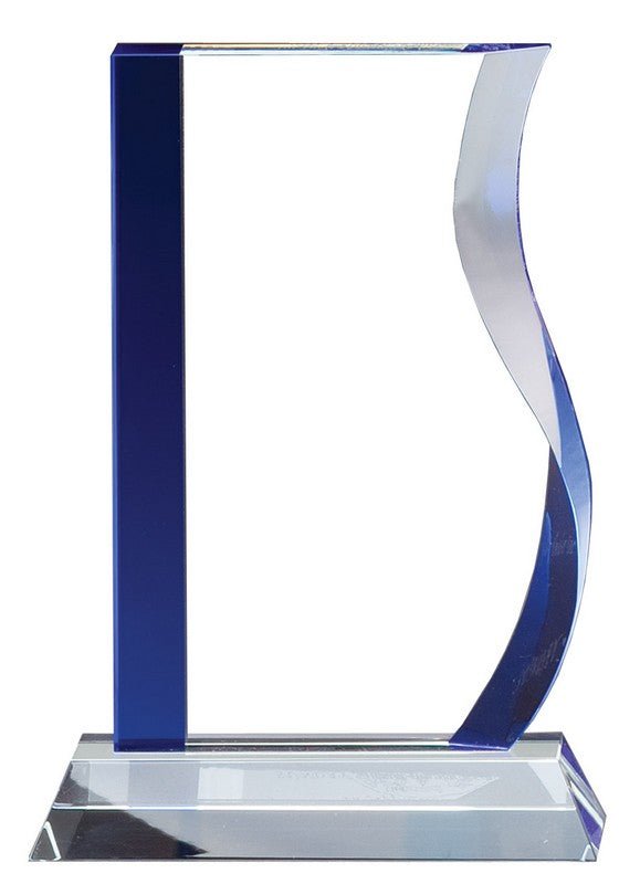 Beautiful Sapphire And Clear Wave Glass Award Mounted On Clear Glass Base. The Award Is Individually Boxed
