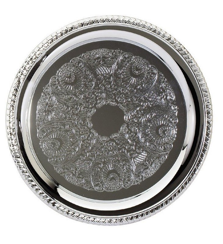 An Elegant Chrome Plated Round Tray With Braided Edge And Area To Engrave