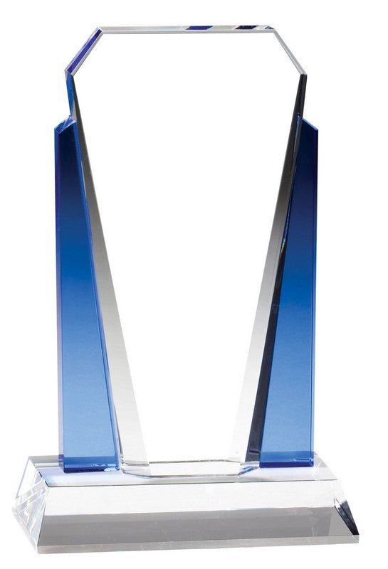 An Elegant Diamond Shape Clear With Sapphire Trim Award And Matching Clear Base, Fully Laser And Rotary Engravable Including Deluxe Velour Lined Presentation Box