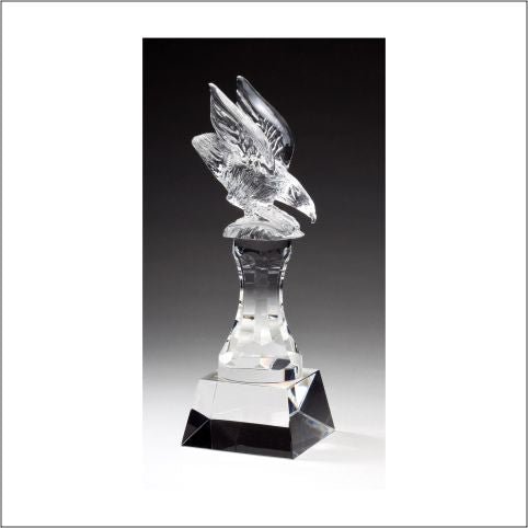 An Elegant In Flight Eagle Landing On Tall Crystal Pedestal , Fully Laser And Rotary Engravable With Deluxe Velour Lined Presentation Box