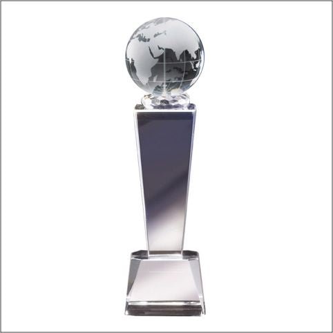 An Elegant And Simple Clear Crystal World Globe On Clear Crystal Pedestal. Includes Deluxe Velour Lined Presentation Box