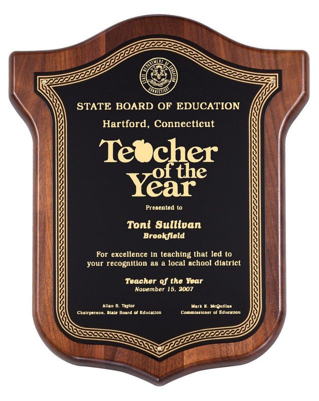Genuine Walnut shield plaque with black grass engraving plate. Individually boxed.