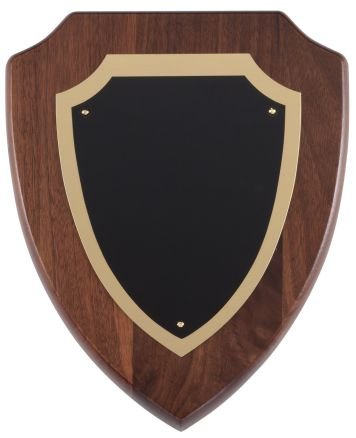 Genuine Walnut Shield Plaque with black and gold engraving plate. Individually boxed.