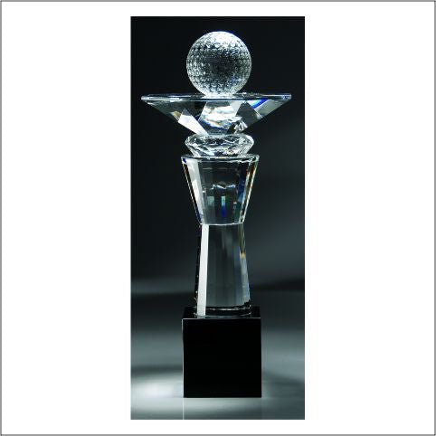 An Elegant Futuristic Golf Crystal Award Mounted On High Gloss Black Base, Fully Laser And Rotary Engravable With Deluxe Velour Lined Presentation Box