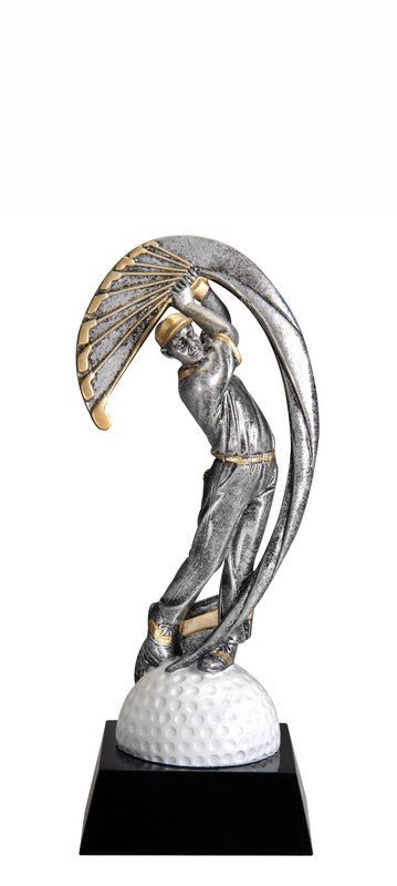 Action Swoosh Pewter And Gold Golf, Male Figure With Full Color Sport Icon On Black Finish Base