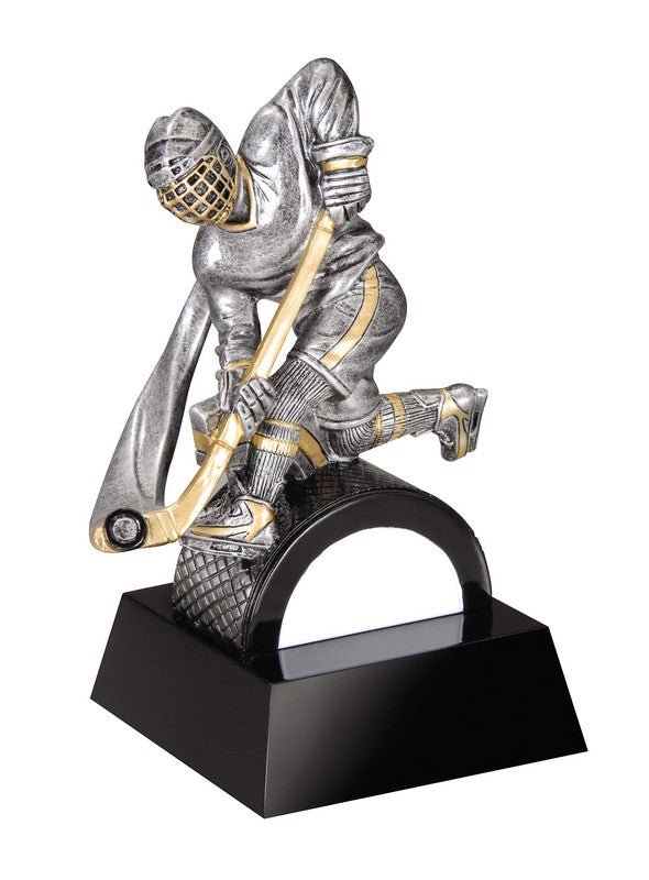 Action Swoosh Pewter And Gold Hockey, Male Figure With Full Color Sport Icon On Black Finish Base