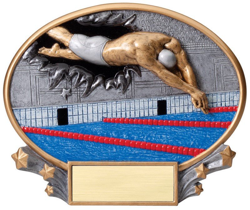 An Explosion Of Full Color Swim, Male Action With Gold Border And Room For An Engraving Plate
