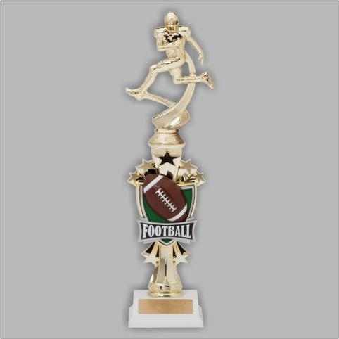 A Motion Football sport Trophy, Including A Tall Full Color Sport Riser, Mounted On A White Finish Base
