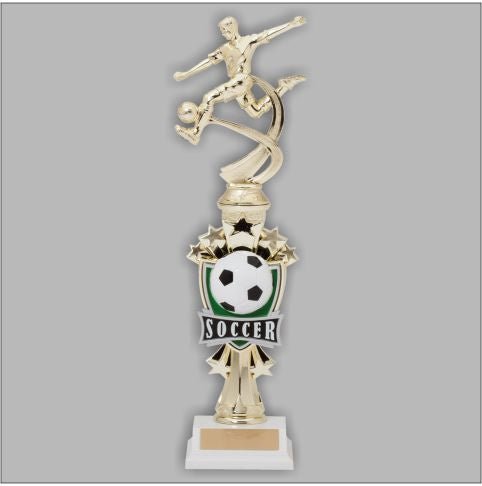 A Motion Soccer, Male Sport Trophy, Including A Tall Full Color Sport Riser, Mounted On A White Finish Base