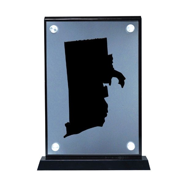 Elegant Black Acrylic Award With A Black Aluminum Engraving Plate That Lasers Silver And A Floating 1/4″ Frosted Acrylic Plated Mounted With Satin Silver Stand Offs With Laser Cut State Outline Providing A Dynamic 3d Appearance