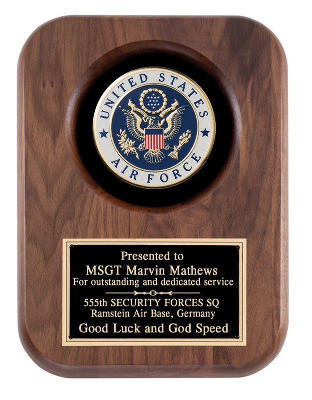Elegant Walnut Air Force Plaque with radius corners, full color Insignia , black and gold engraving plate and individually boxed