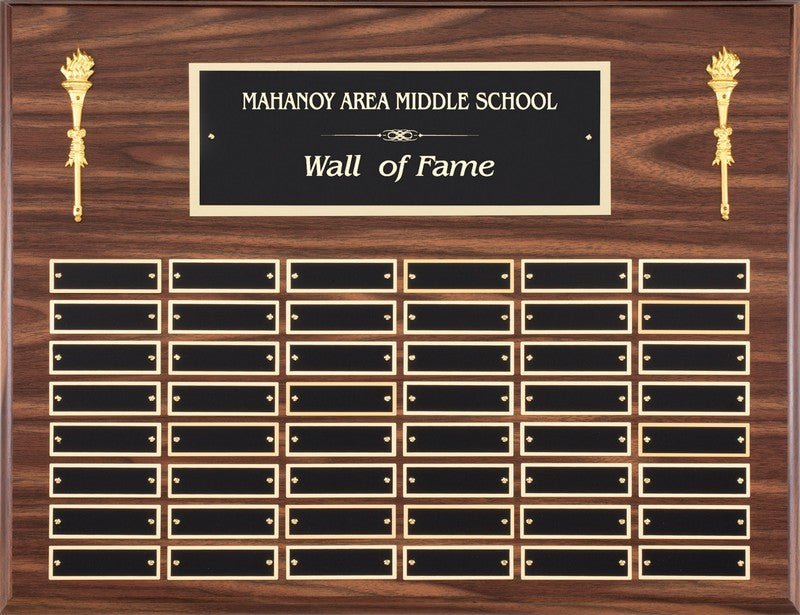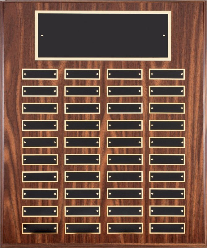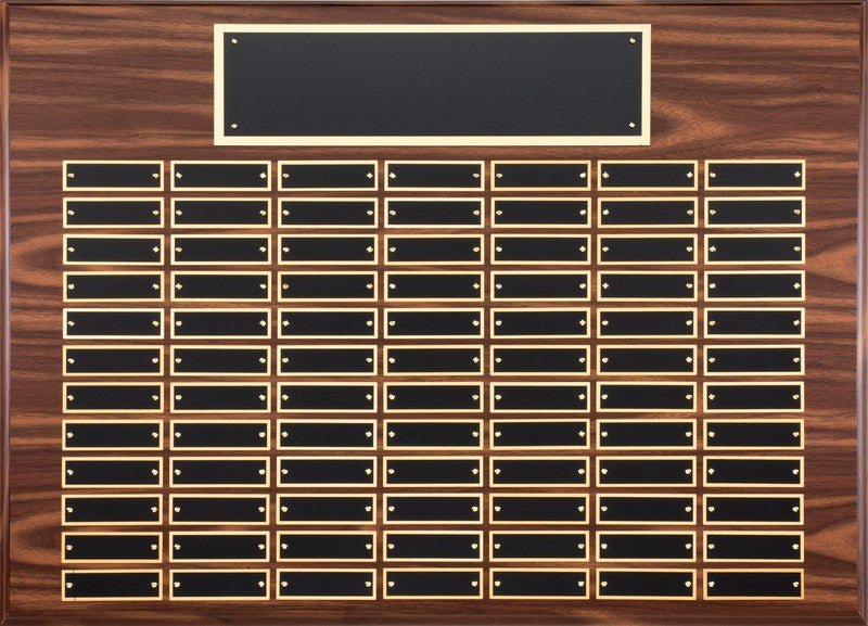 Walnut finish horizontal perpetual plaque with 84 black plates and matching header plate. Individually boxed.